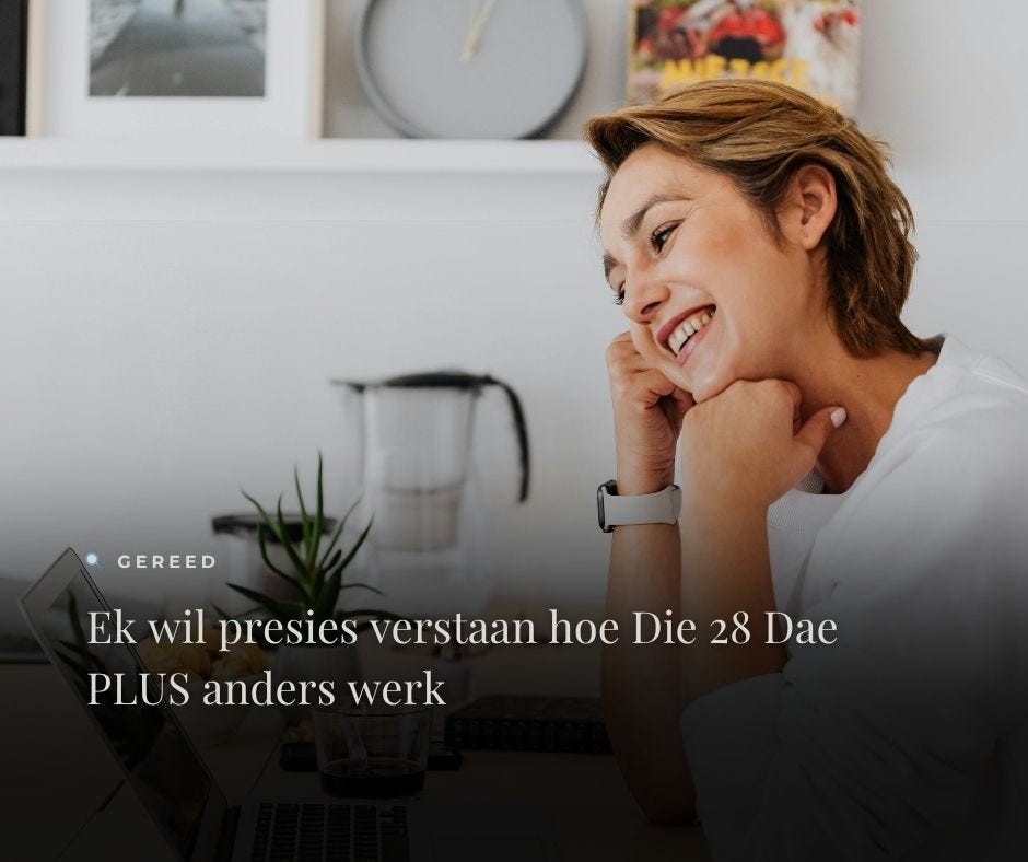 Welkom by Die 28 Dae PLUS - Die evolusie van Die 28 Dae Eetplan, spesifiek gebou vir besige vroue van 40+ met te min tyd en te veel verantwoordelikheid.